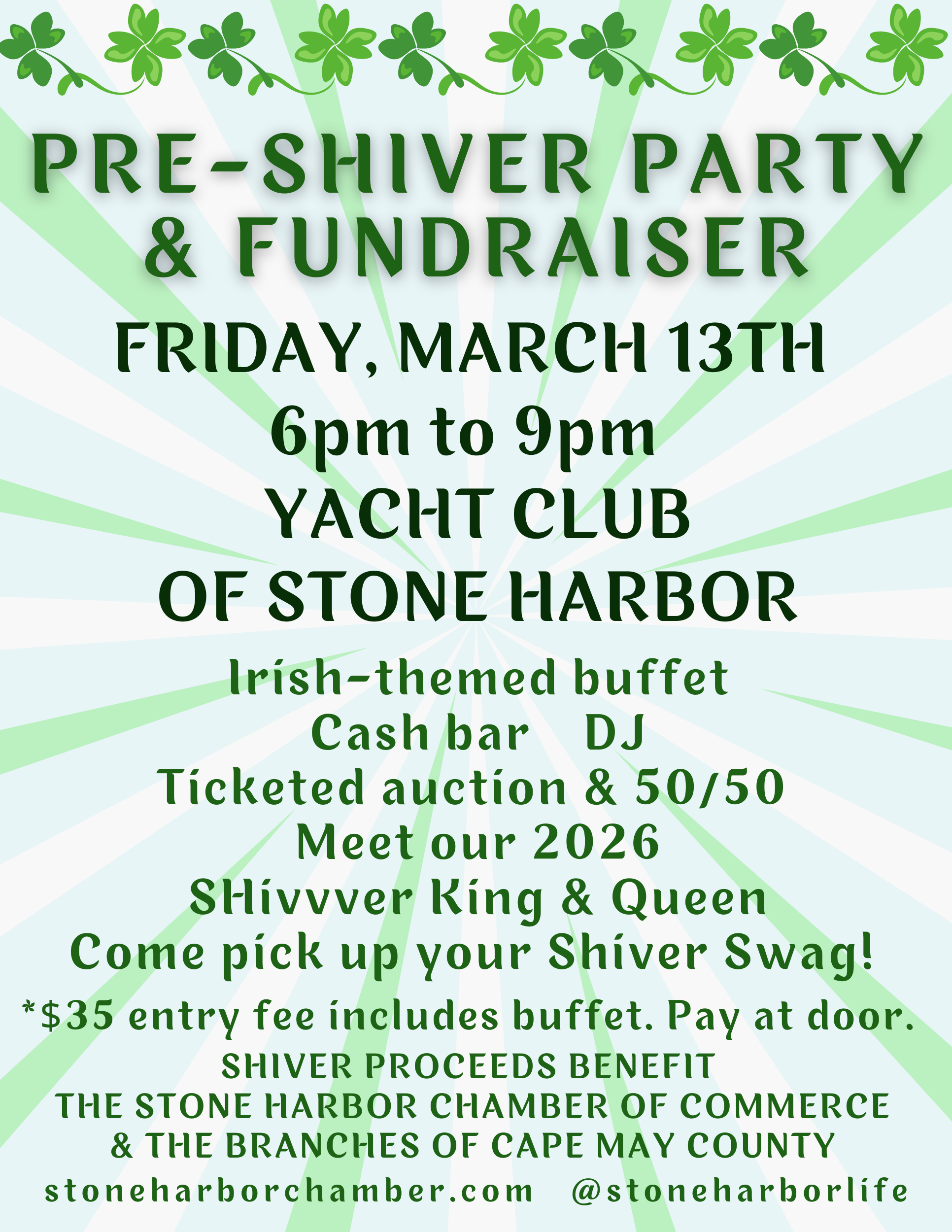 Join us for our great Pre-Shiver Party at the Yacht of Stone Harbor, Friday, 3/14, at 6pm. $35 Irish Buffett and cash bar. Auction, 50/50, DJ & more! Everyone is welcome - pay at the door (no reservations.)